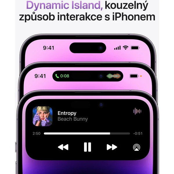 Dynamic Island vám ukazuje přehrávanou hudbu, sportovní výsledky, příchozí FaceTime hovory a spoustu dalších věcí. Přitom nezasahuje do toho, co zrovna děláte.